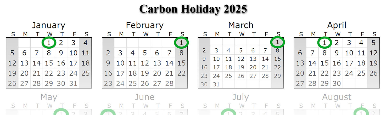 The Carbon Holiday begins Jan 1st, repeating thereafter on the first day of each month. The holiday will grow in duration as more people join..